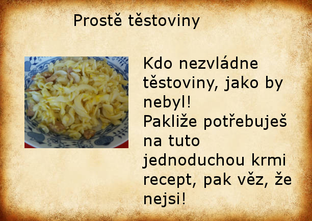 Vážený čtenáři! Přestože se ti možná následující zkouška bude zdát oproti zkouškovým normám krátká, nezapomínej, že obsahuje velké množství obrazových materiálů, jejichž příprava a konzumace zabrala podstatnou část času. Jestliže nevěříš svým očím, uvěř svým chuťovým buňkám a "kouzla v kuchyni" vyzkoušej!Příjemné počtení a dobrou chuť!